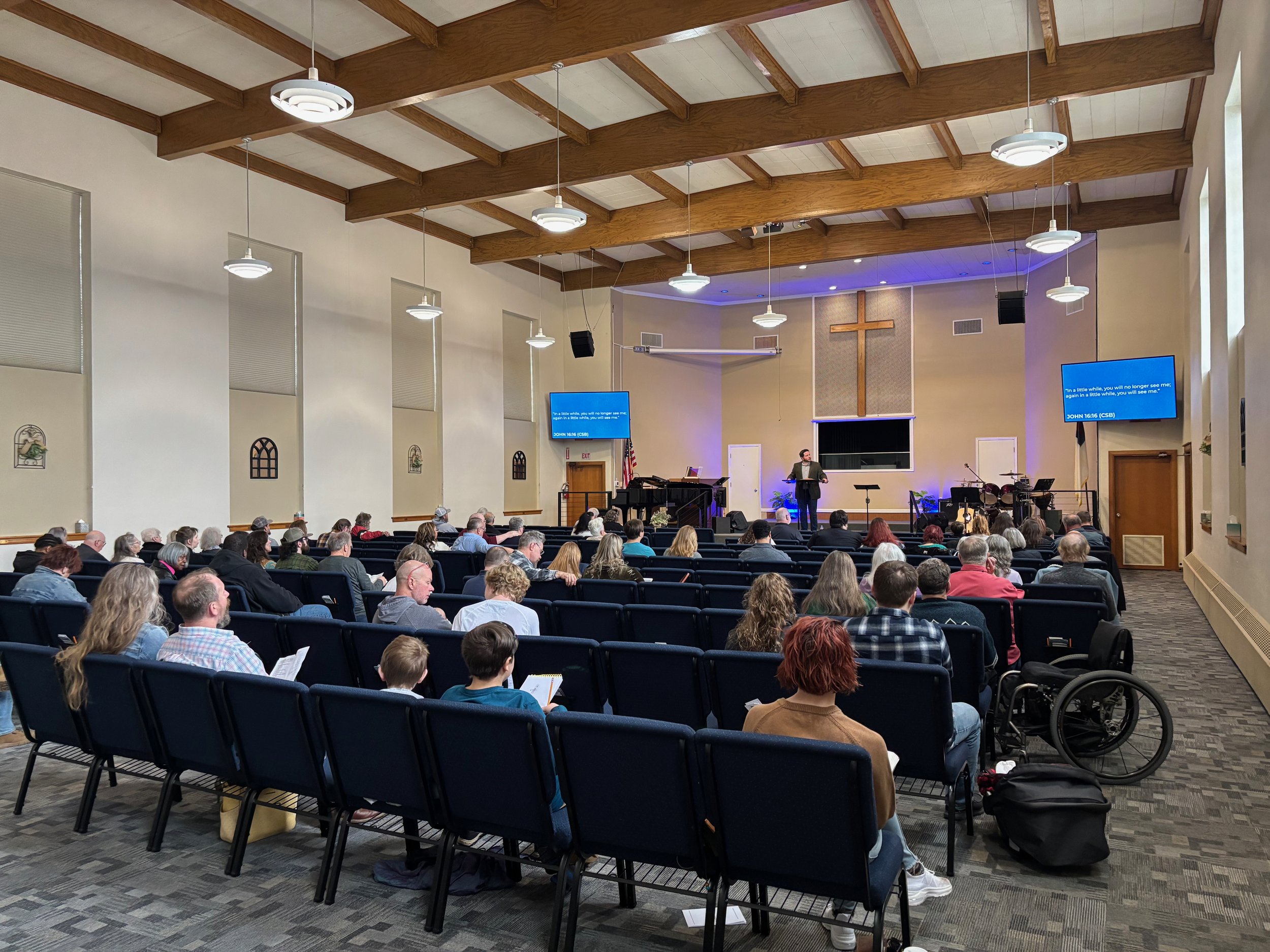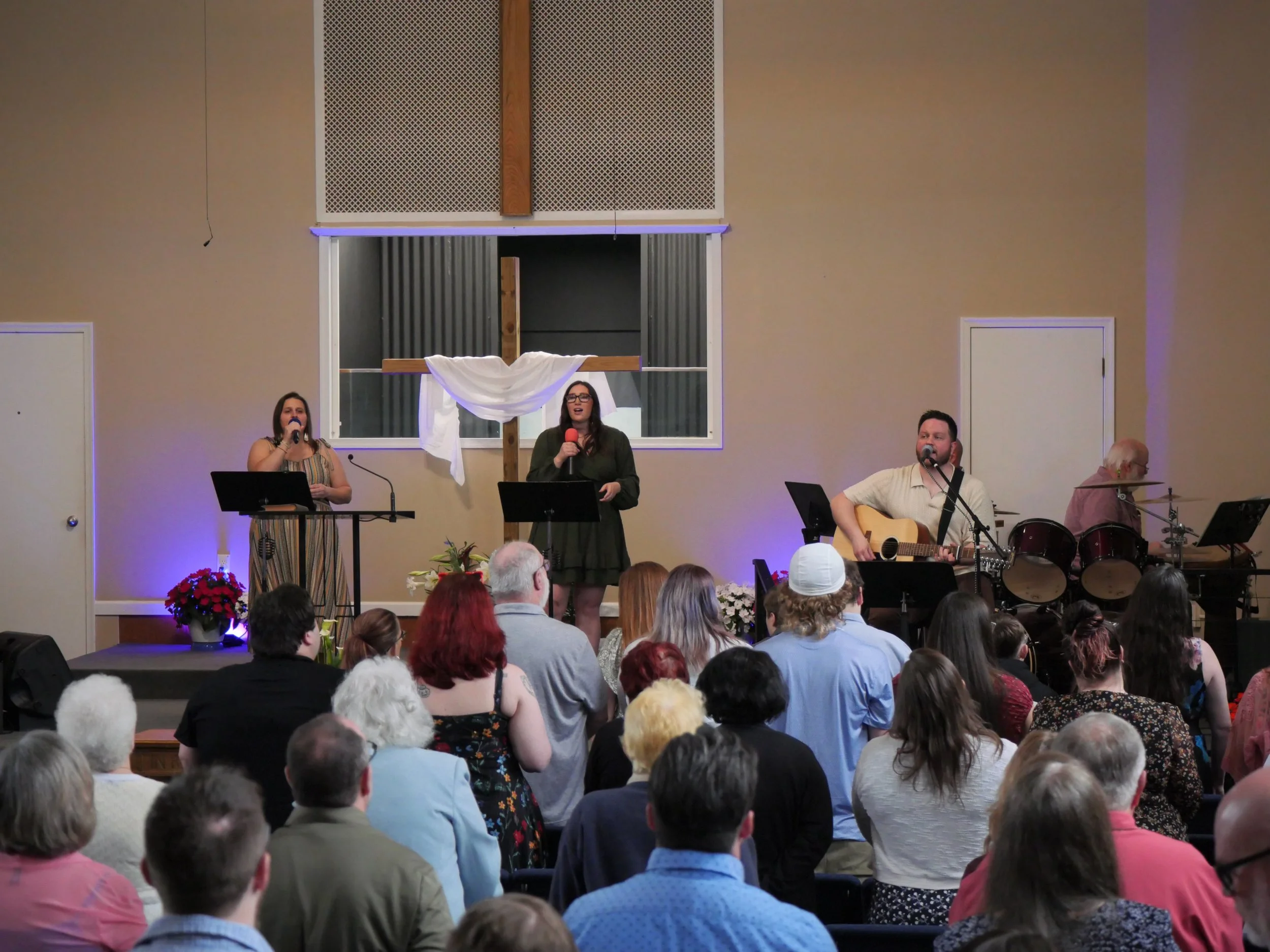 There are no assigned seats in the auditorium, so sit wherever you feel most comfortable! If you struggle with being able to read words from far away, we’d encourage you to sit in the front half of the auditorium as the words we sing and read together are so helpful for our lives!