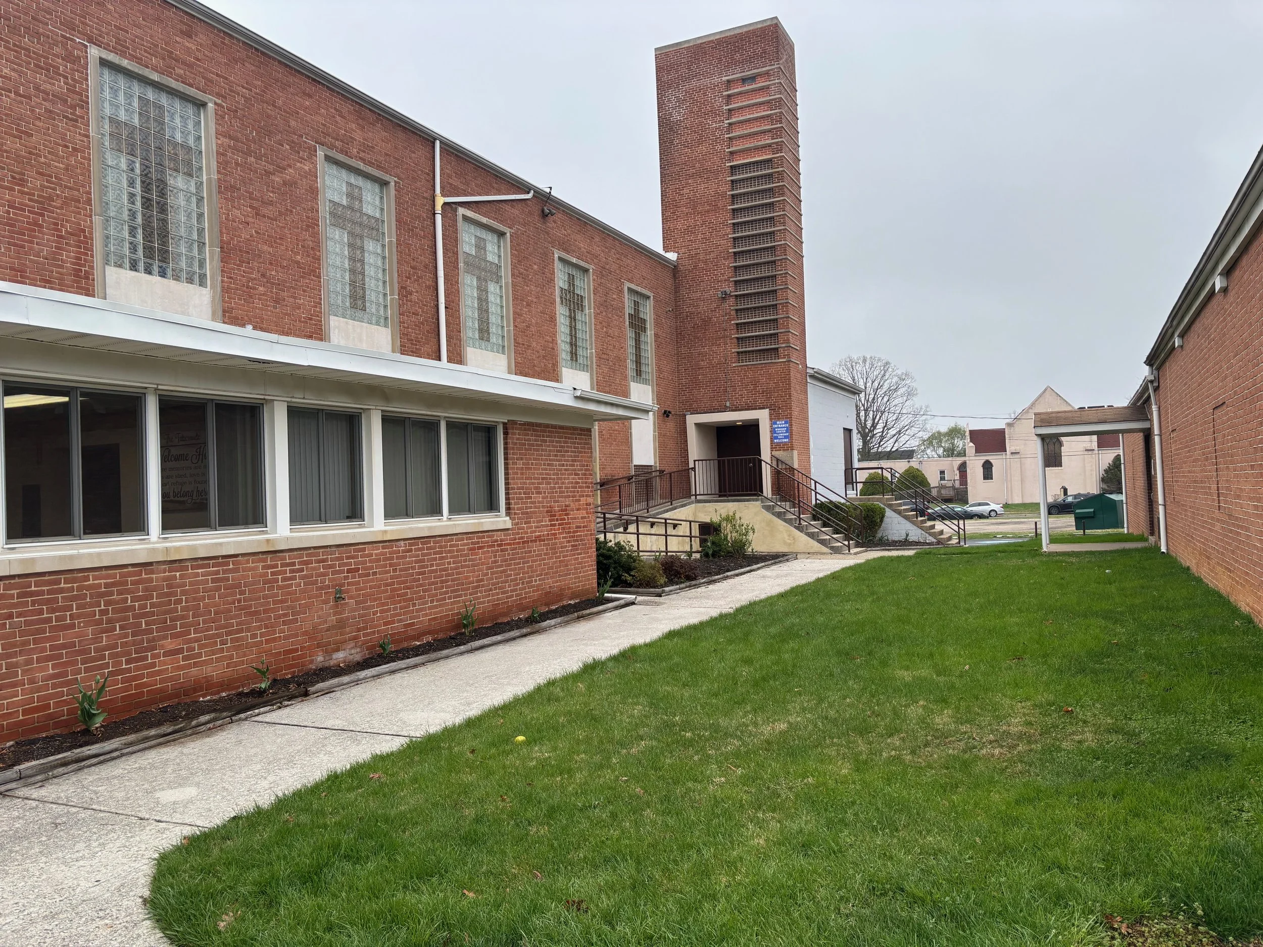 Our church building houses our auditorium, offices, and our downstairs multipurpose hall. It is also wheelchair accessible. Use the sidewalk between the two buildings to easily get to the stairs or ramp that will take you up to the front door of the church